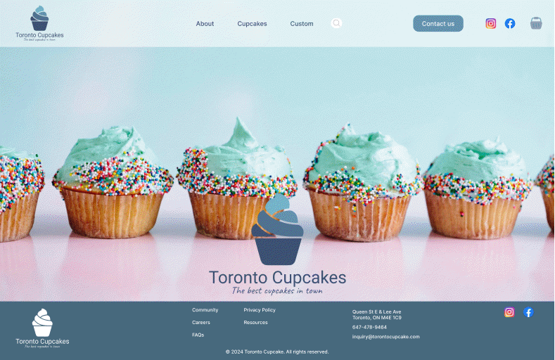 Toronto Cupcakes is a local bakery known for its colorful, custom cupcakes. This academic project focused on improving the website’s navigation structure and visual identity. The original site had a cluttered header, hard-to-find information, and an inconsistent style. The redesign simplified the navigation, refreshed the header layout, and introduced a new logo and color palette that better reflect the brand’s playful yet elegant personality.